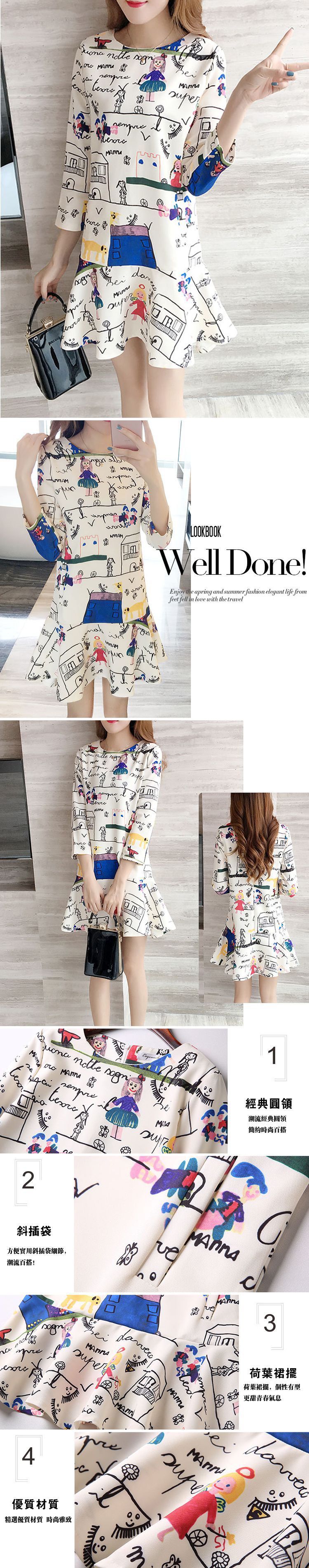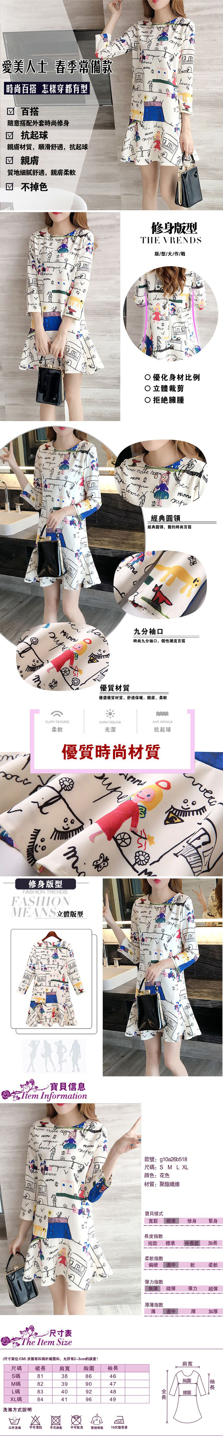 *ORead*魚尾裙擺七分袖卡通圖案荷葉邊連身裙(花色S)