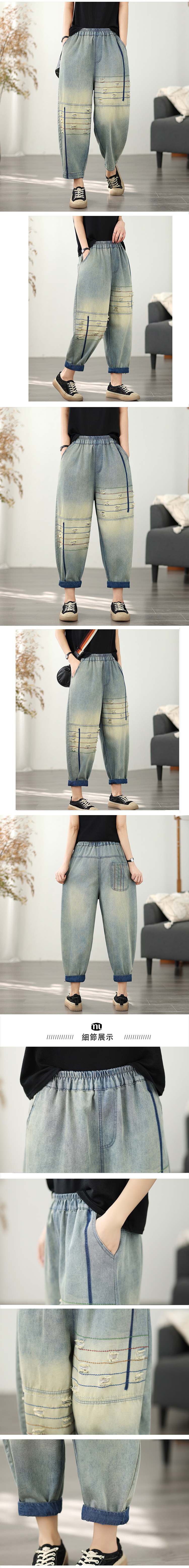 彩色線條刺繡拼接破洞九分牛仔褲(藍色M~2XL)