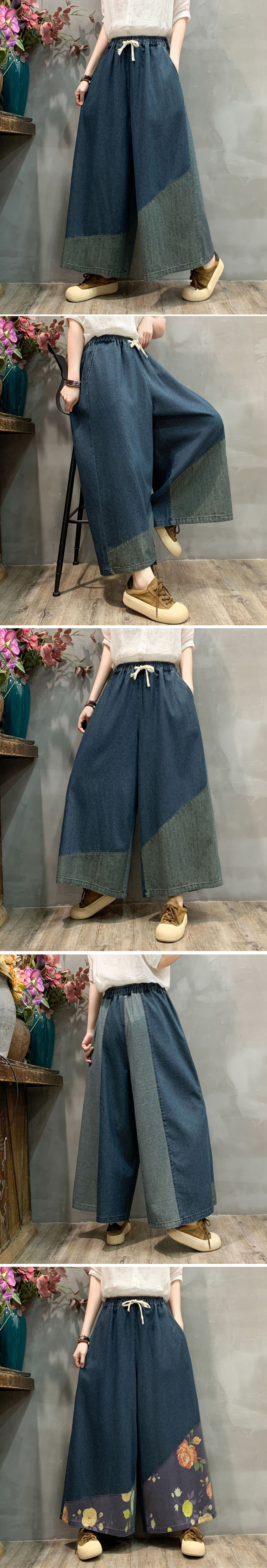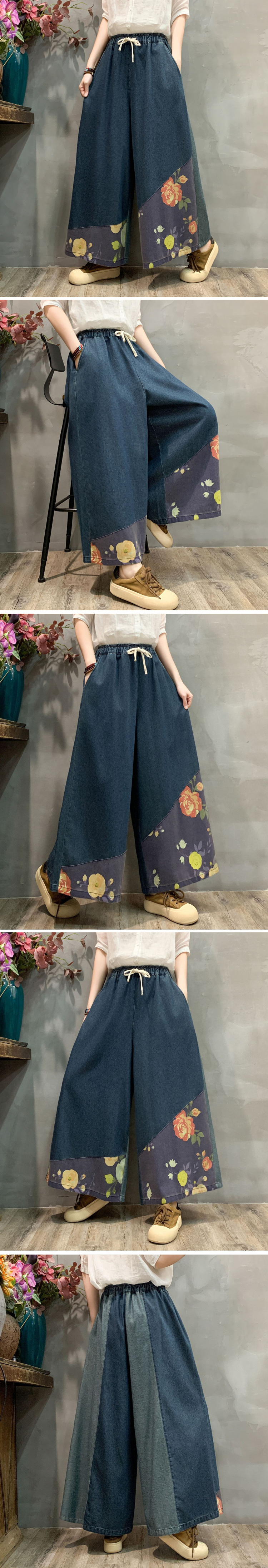 復古印花寬腿鬆緊腰做舊牛仔裙褲